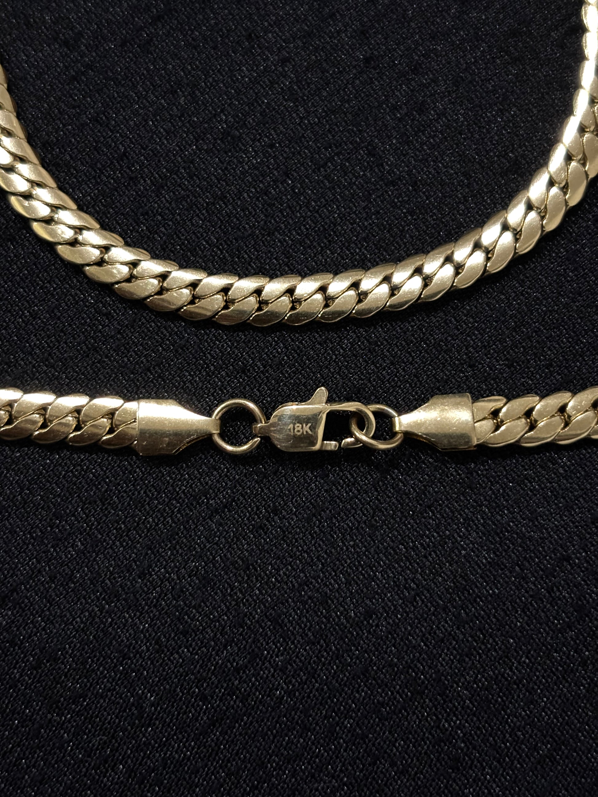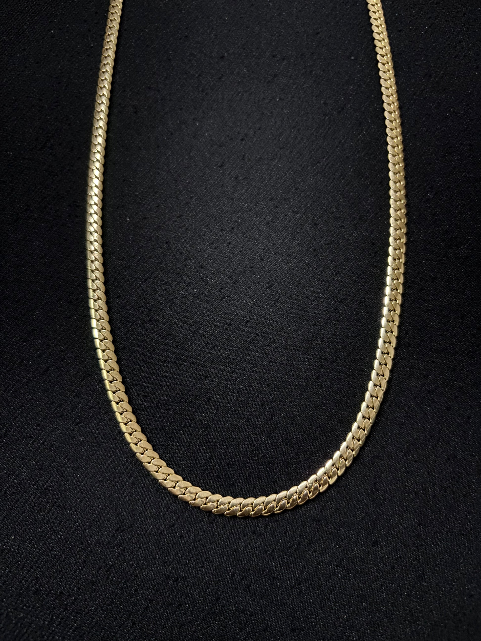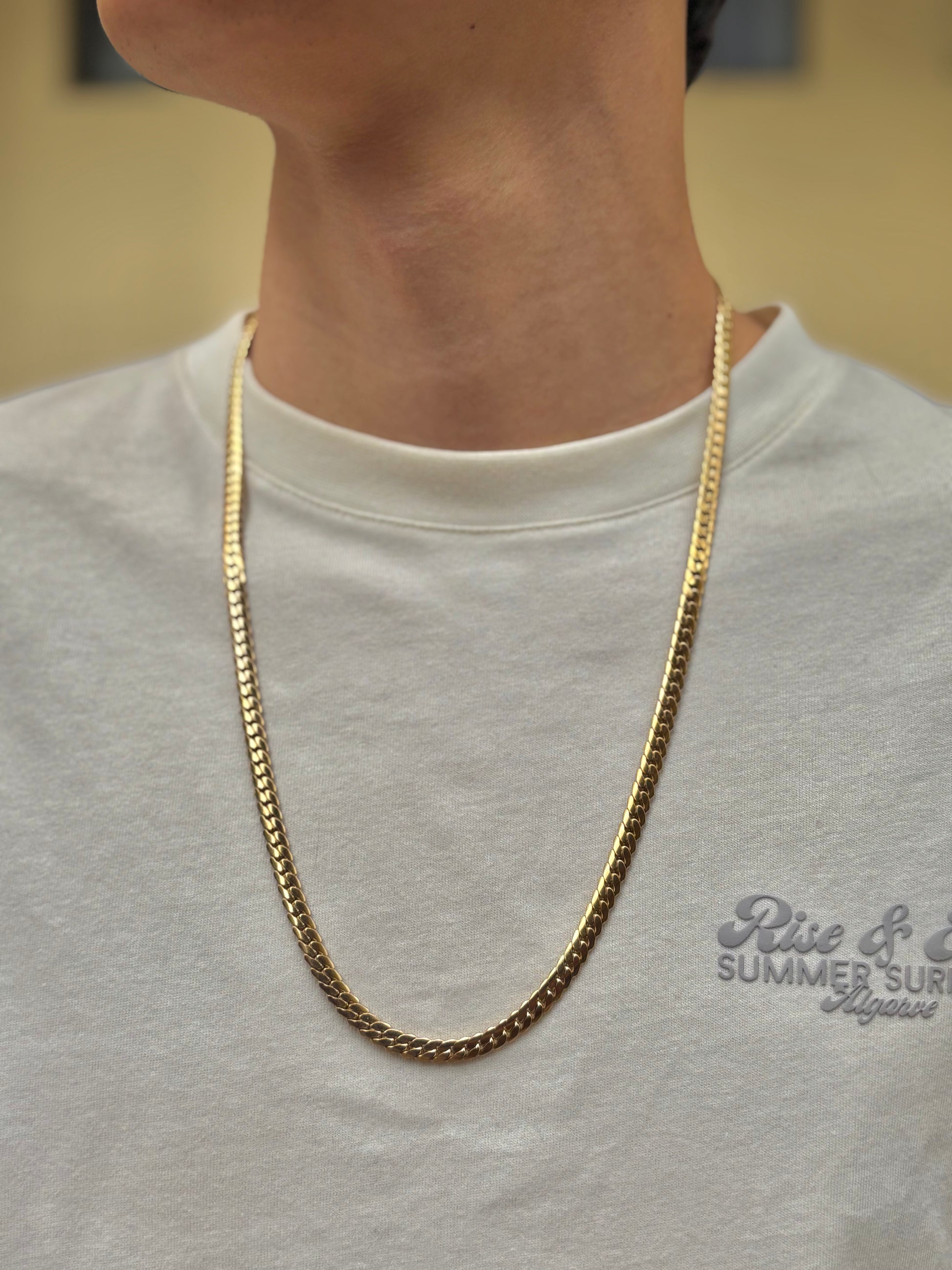 Cadena Serpiente en oro laminado de 18K, con un tejido escamoso y continuo que imita la suavidad de su nombre. Su broche 18K contramarcado asegura calidad, mientras su diseño flexible y brillante envuelve el cuello con un estilo audaz y sofisticado.