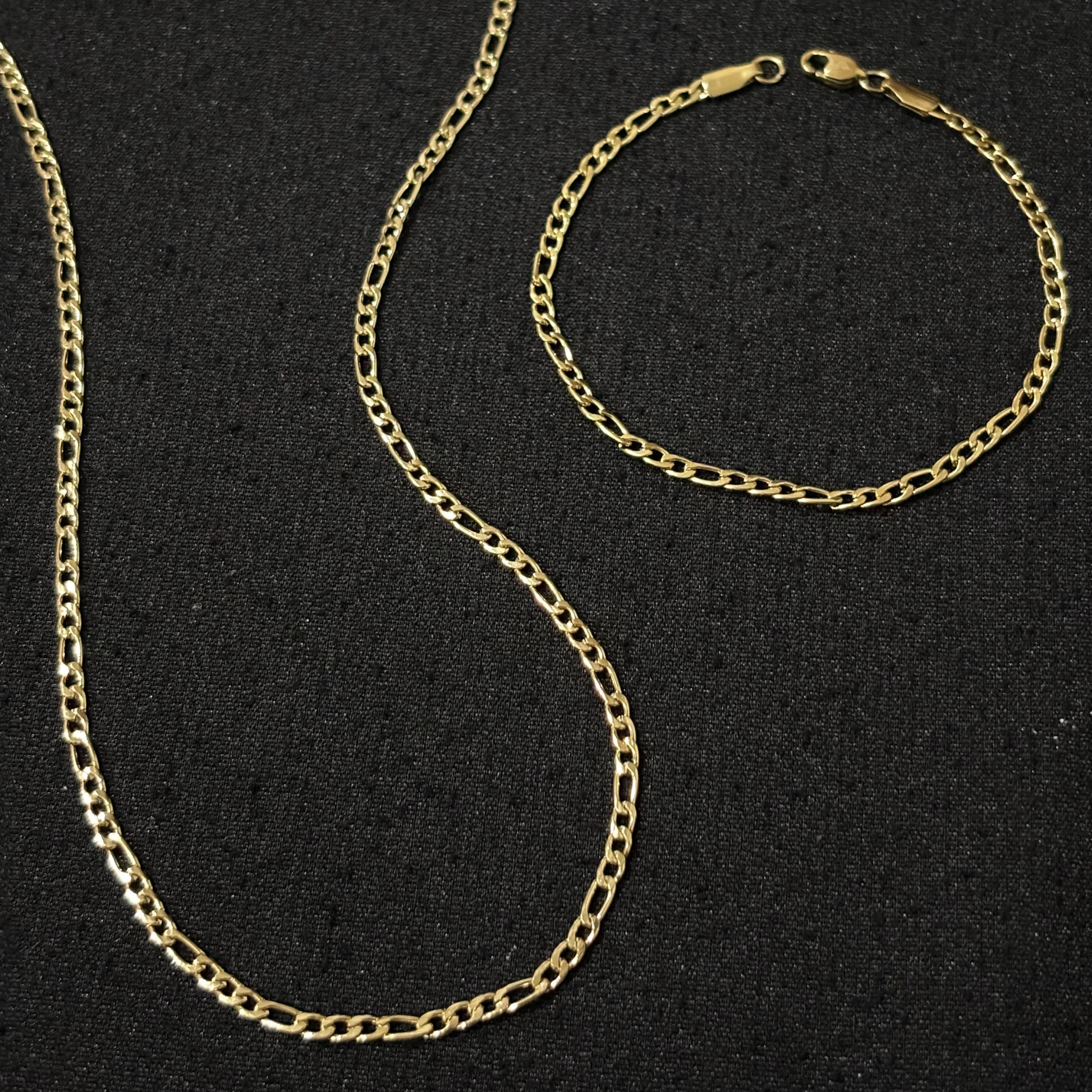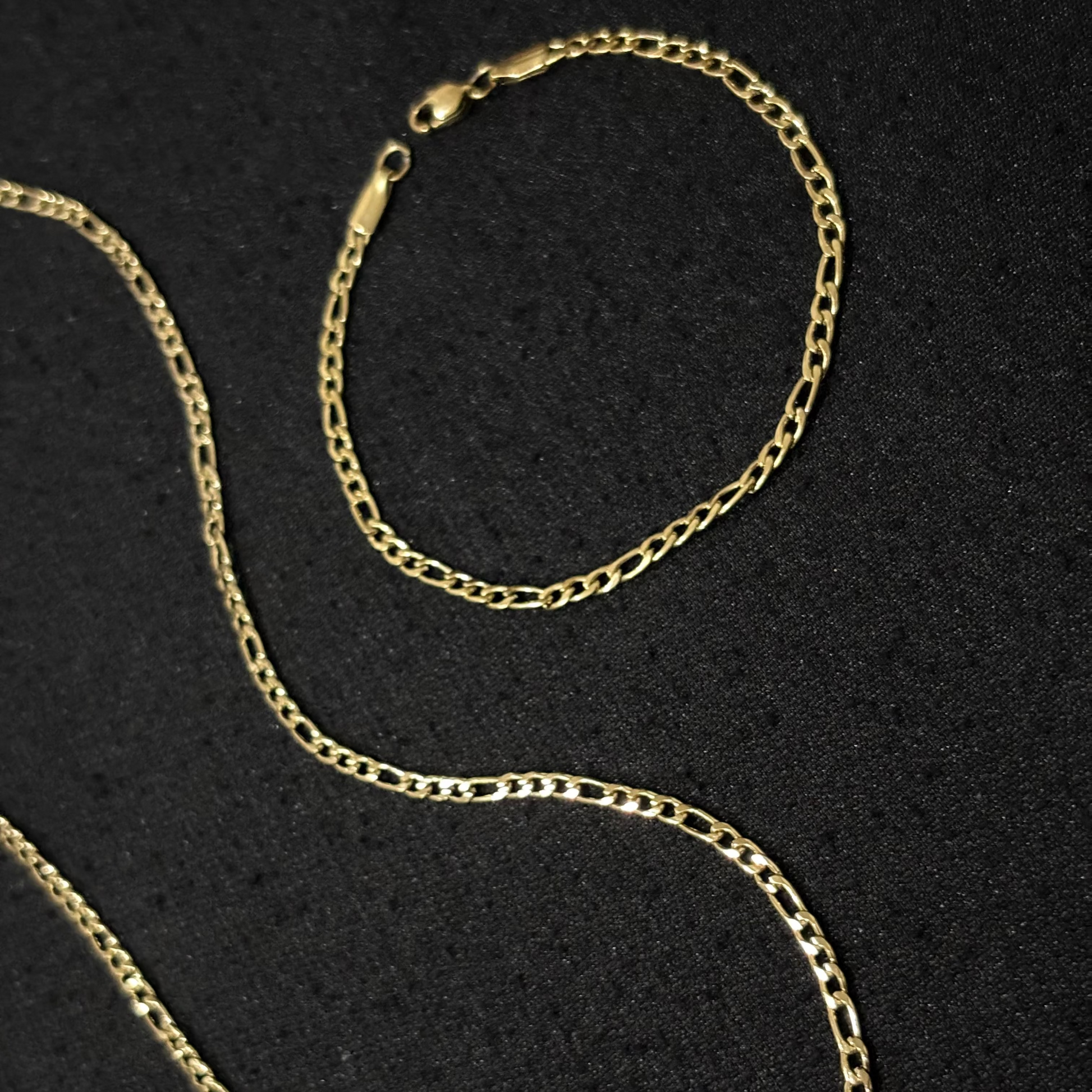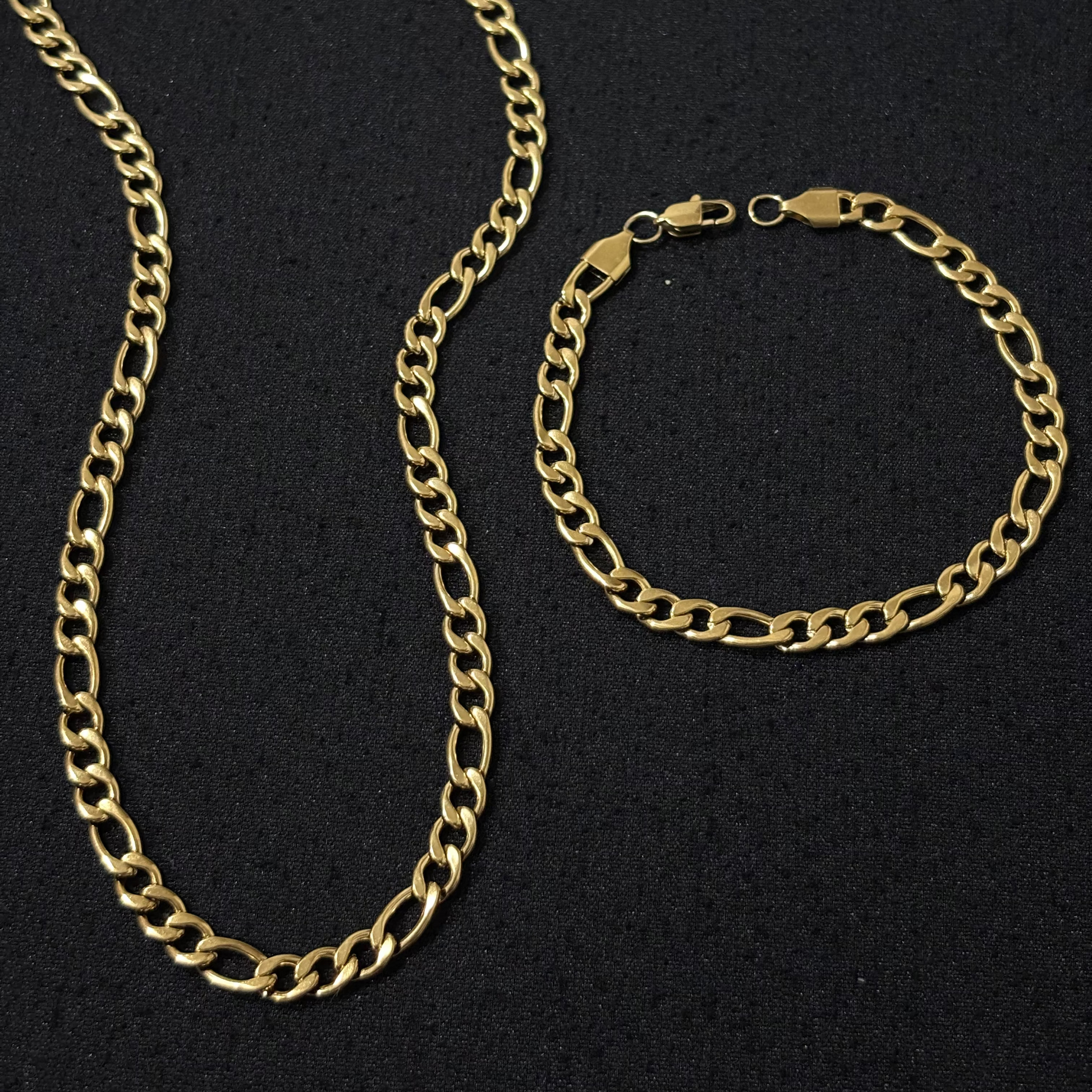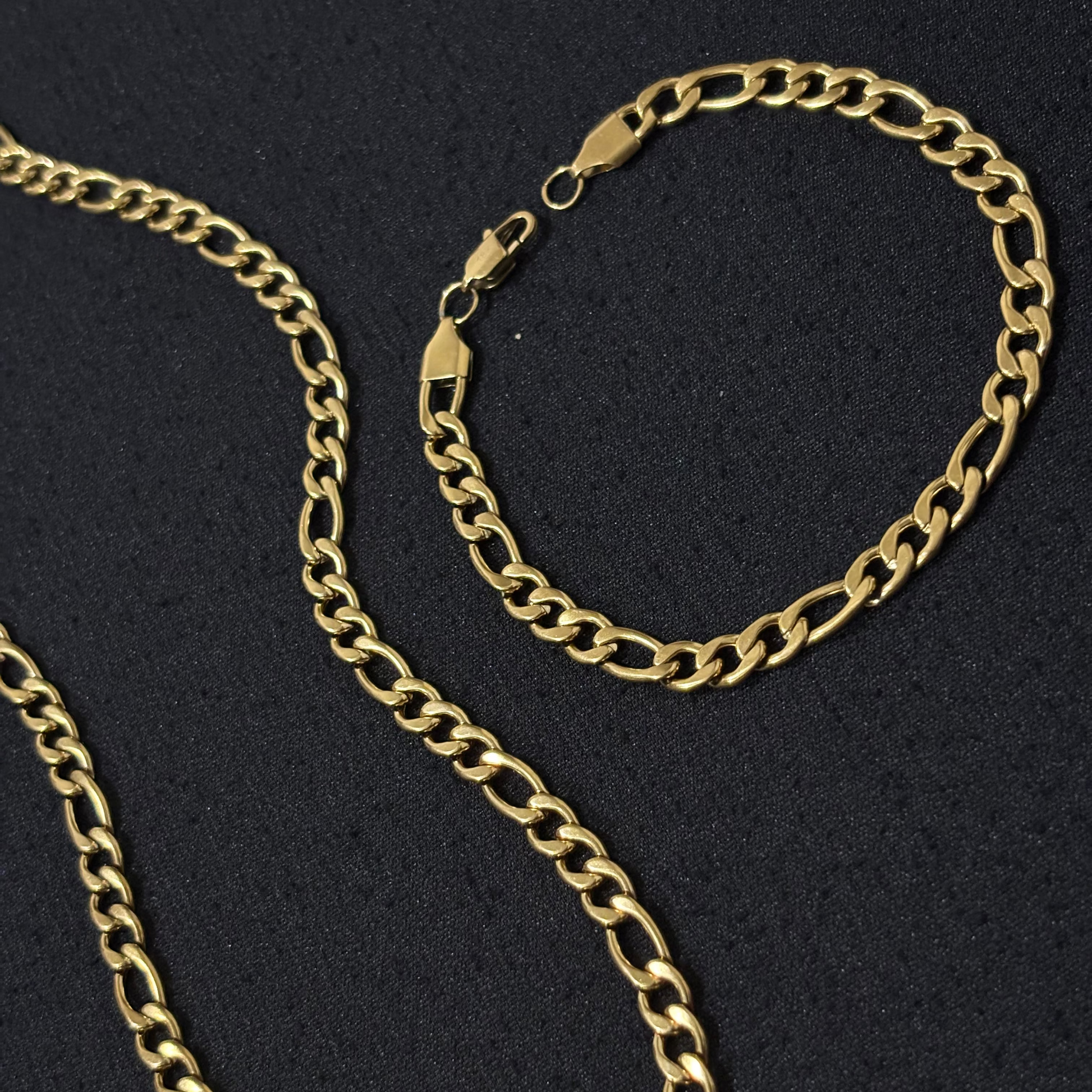 Combo Cartier en oro laminado de 18K. Cadena y pulsera con eslabones alargados y profundos que generan un contraste elegante y sofisticado en la muñeca y el cuello. Su acabado pulido y los broches 18K contramarcados refuerzan la calidad de un set pensado para destacar con estilo refinado.