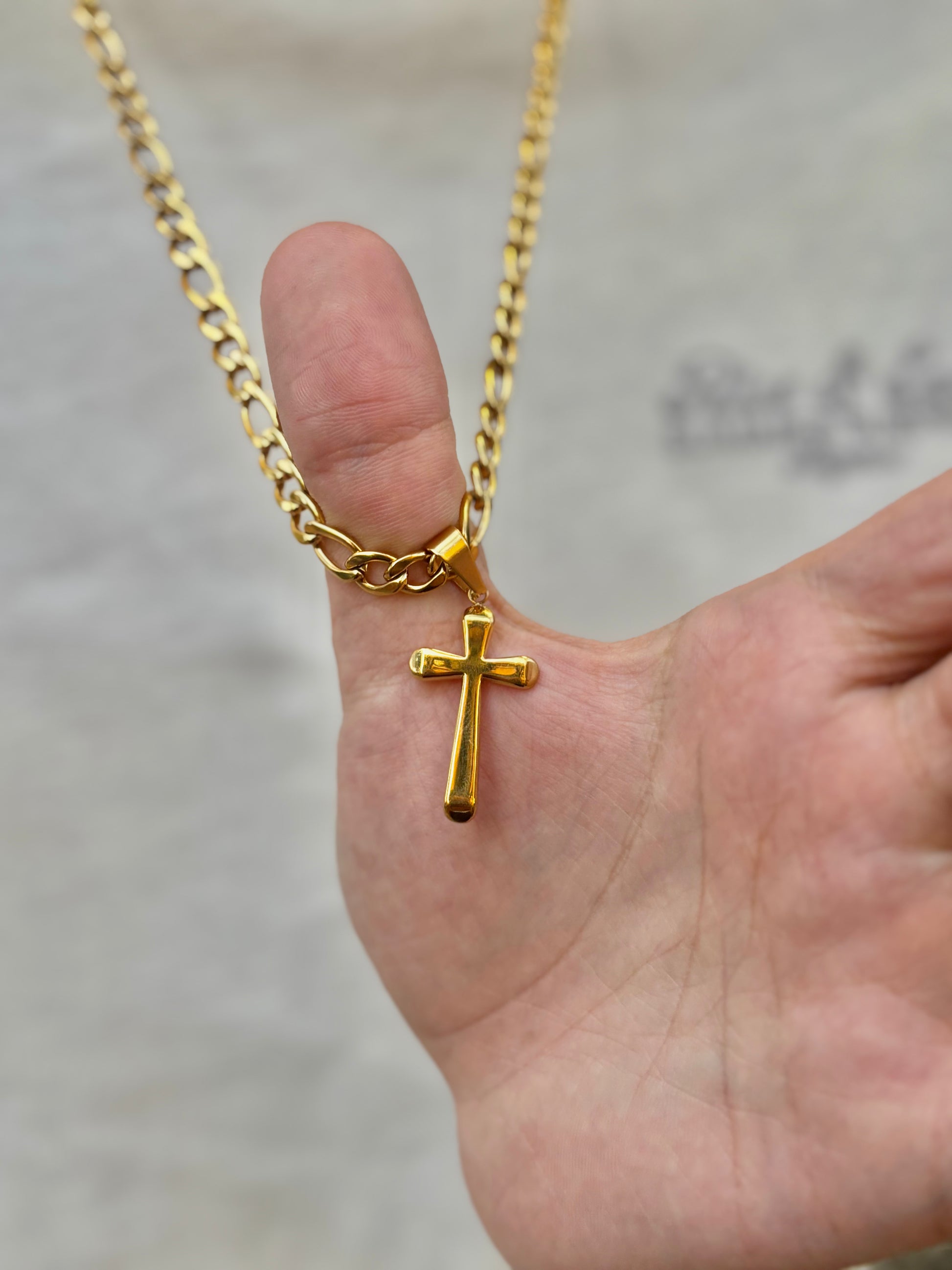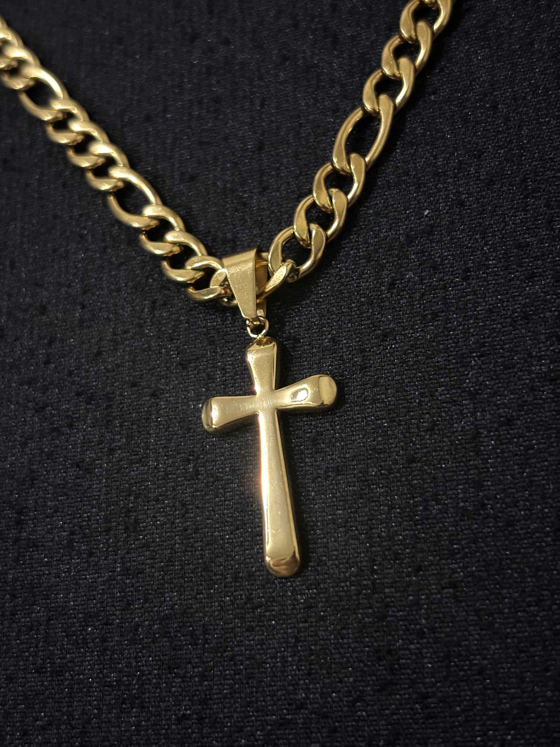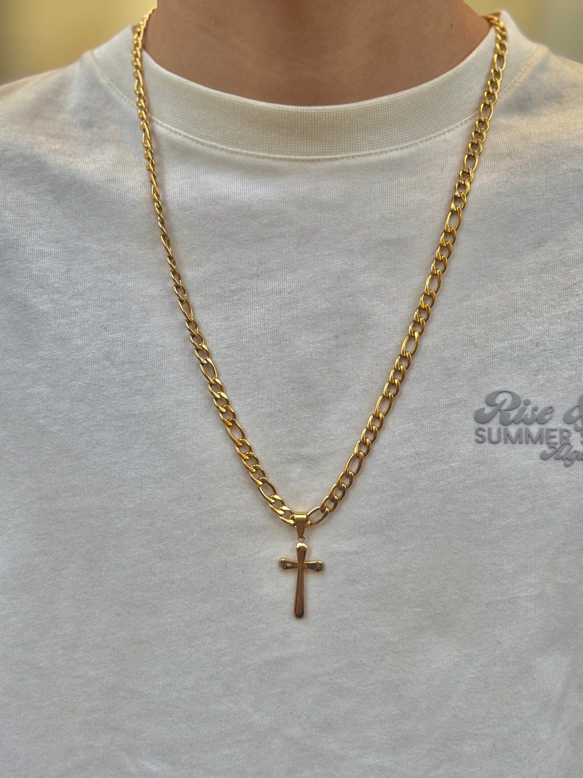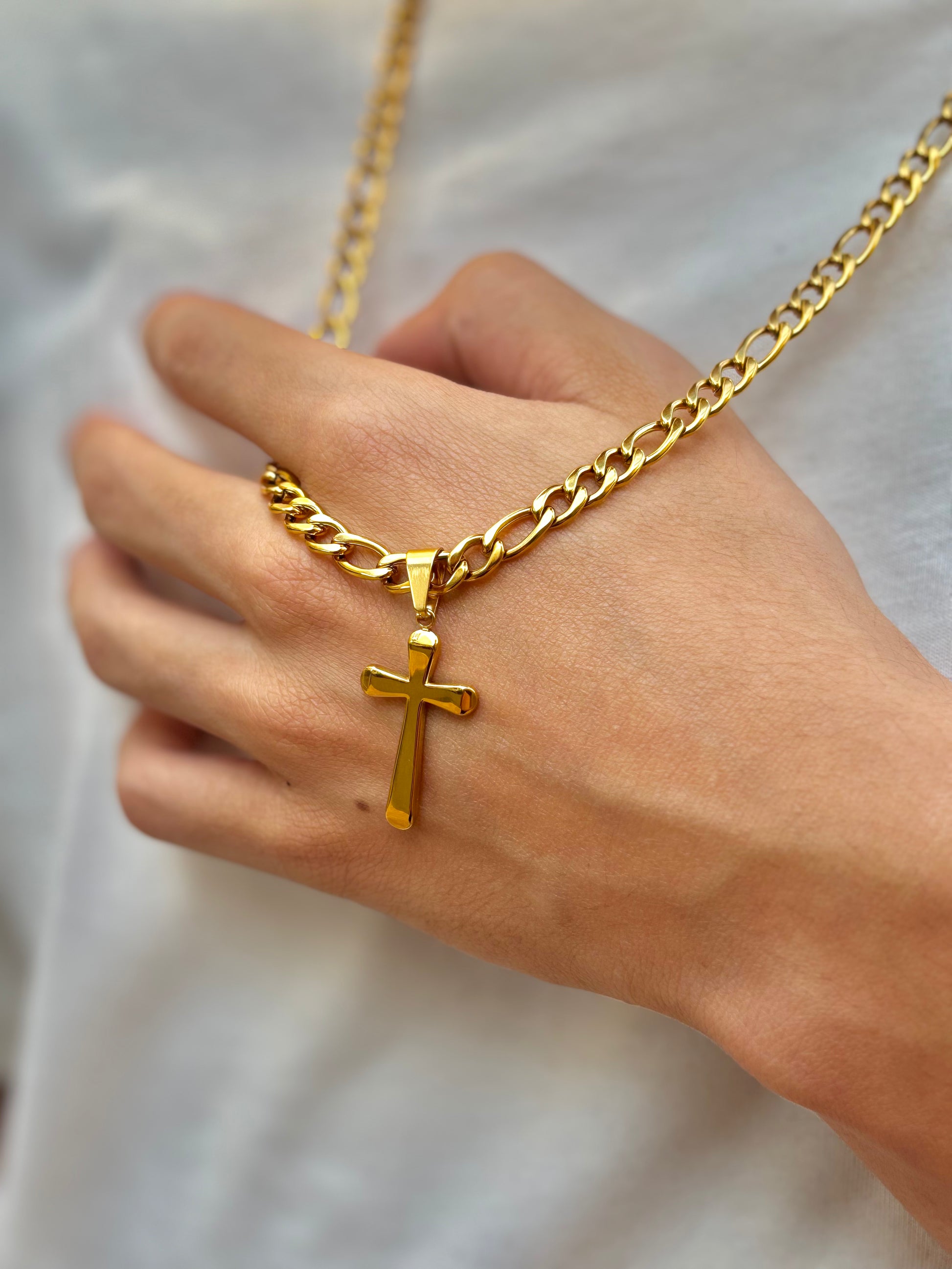 Combo en Oro Laminado 18K: Cadena 3X1 de 6 mm x 65 cm con dije de cruz. Una pieza que une estilo y devoción, simbolizando fe, fuerza y protección. Con broches contramarcados 18K que refuerzan su autenticidad.