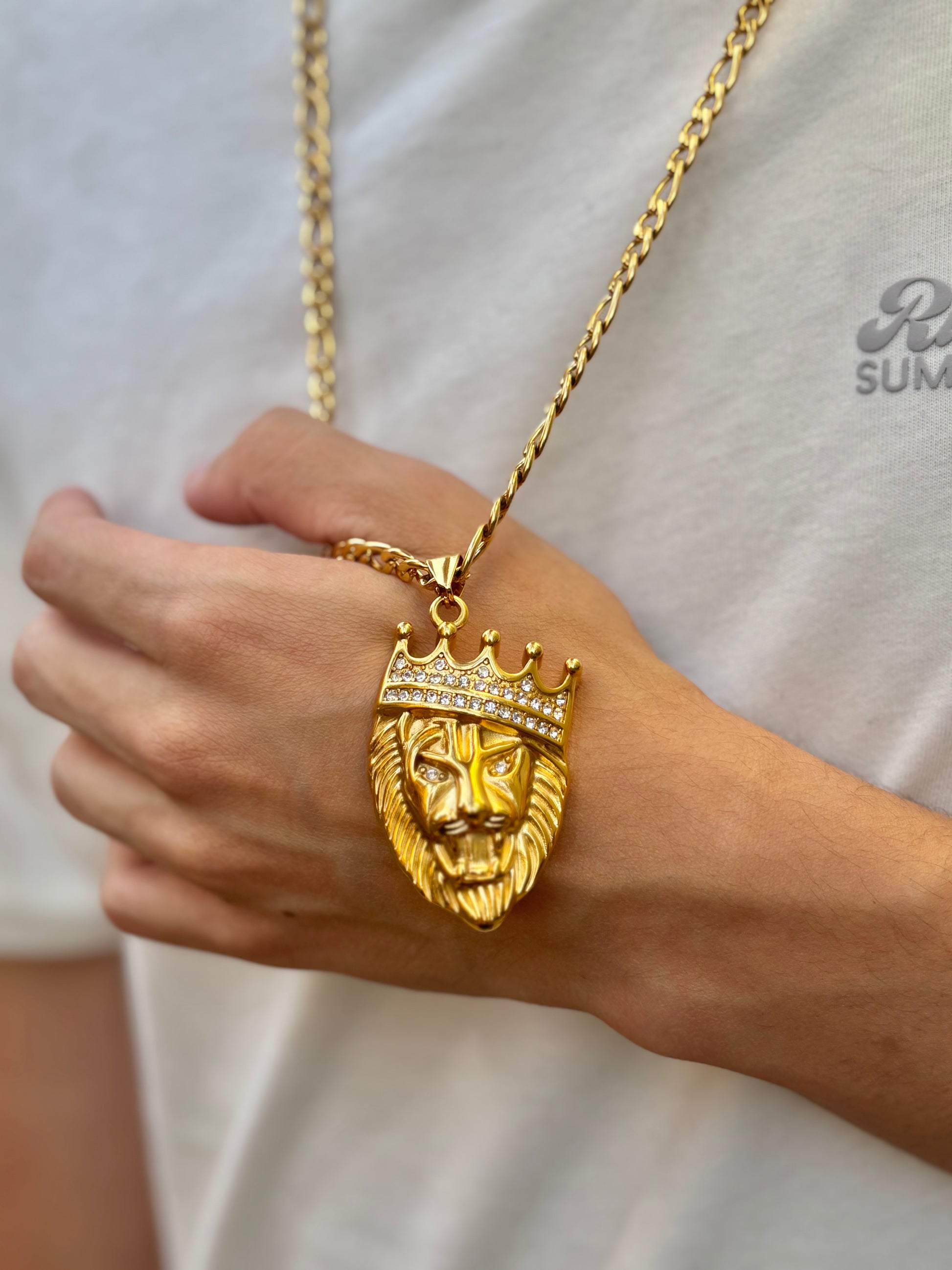 Combo en Oro Laminado 18K: Cadena 3X1 de 6 mm x 65 cm con dije de león grande. Un conjunto que representa fuerza, liderazgo y valentía, acompañado de broches contramarcados 18K que destacan su autenticidad y estilo.