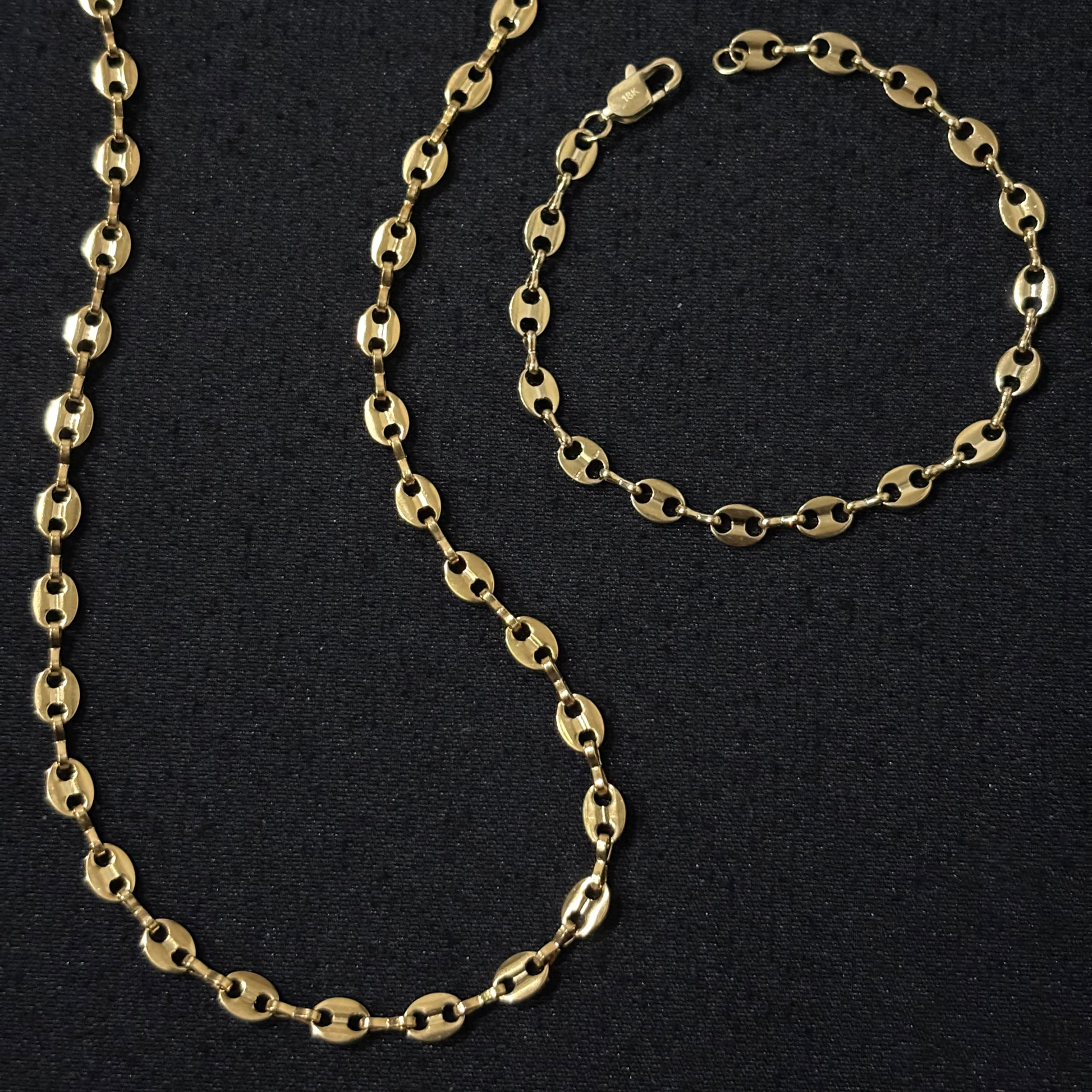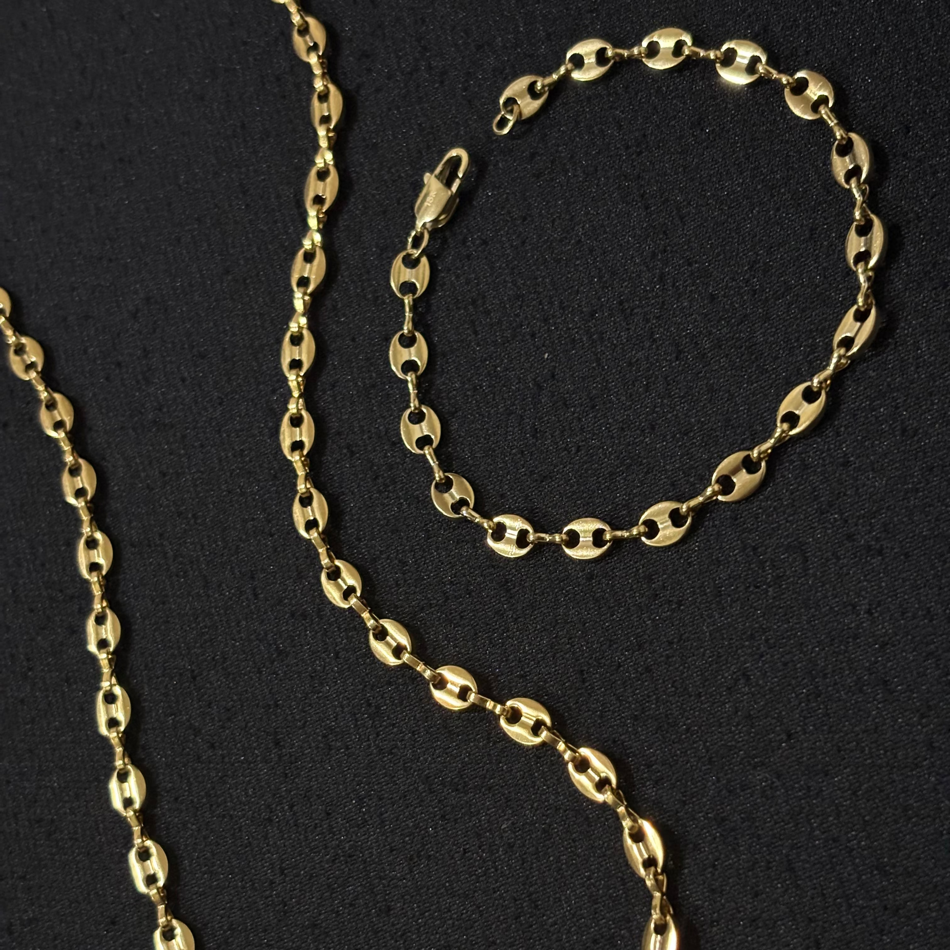 Combo Gucci en oro laminado de 18K: cadena de 60 cm y pulsera con tejido grano de café. Un diseño con personalidad propia, que combina la firmeza de sus eslabones con un acabado sutil y elegante. Broches 18K contramarcados que refuerzan su calidad, pensado para quienes buscan un estilo diferente, con un aire lujoso y sofisticado.