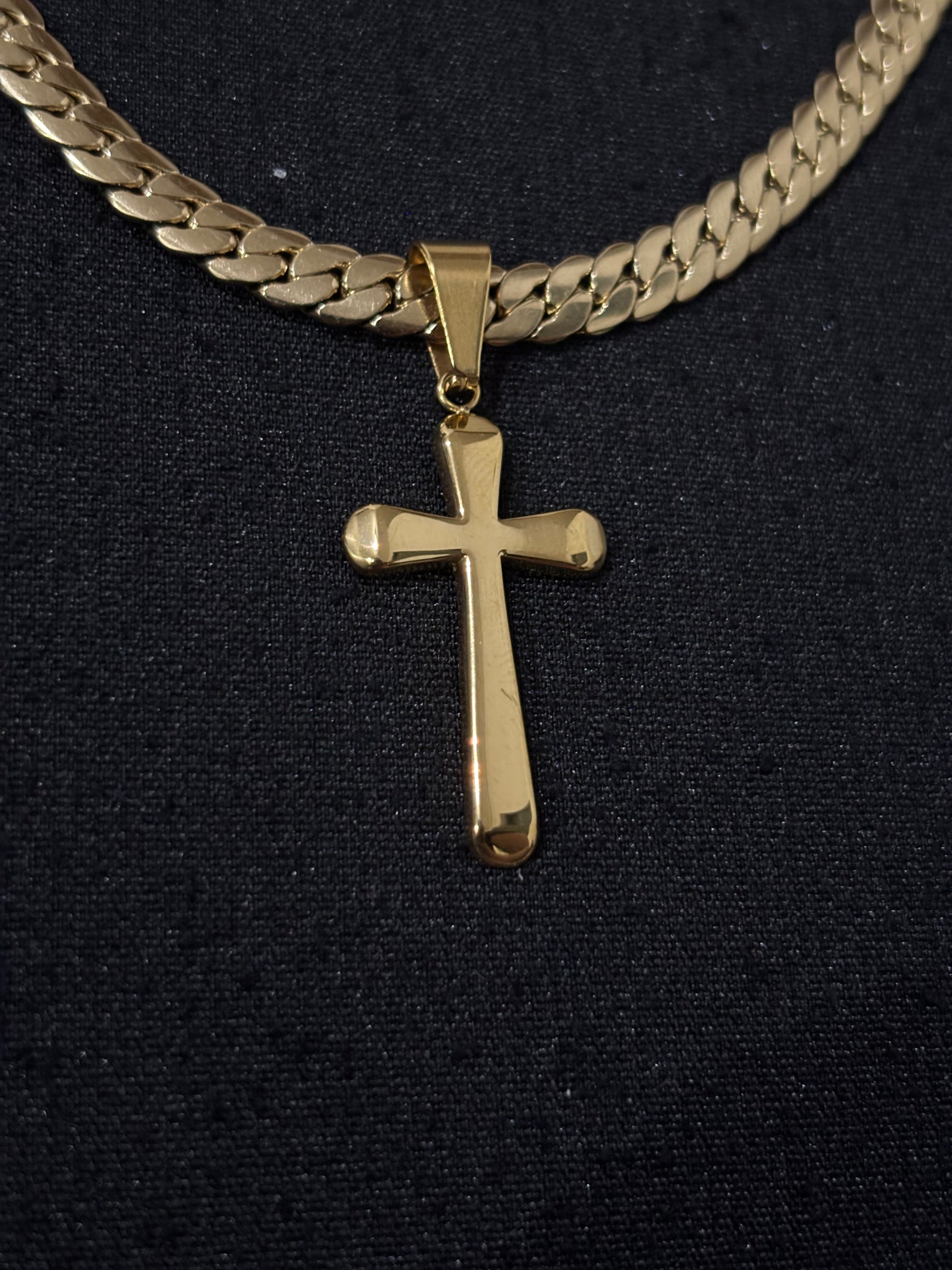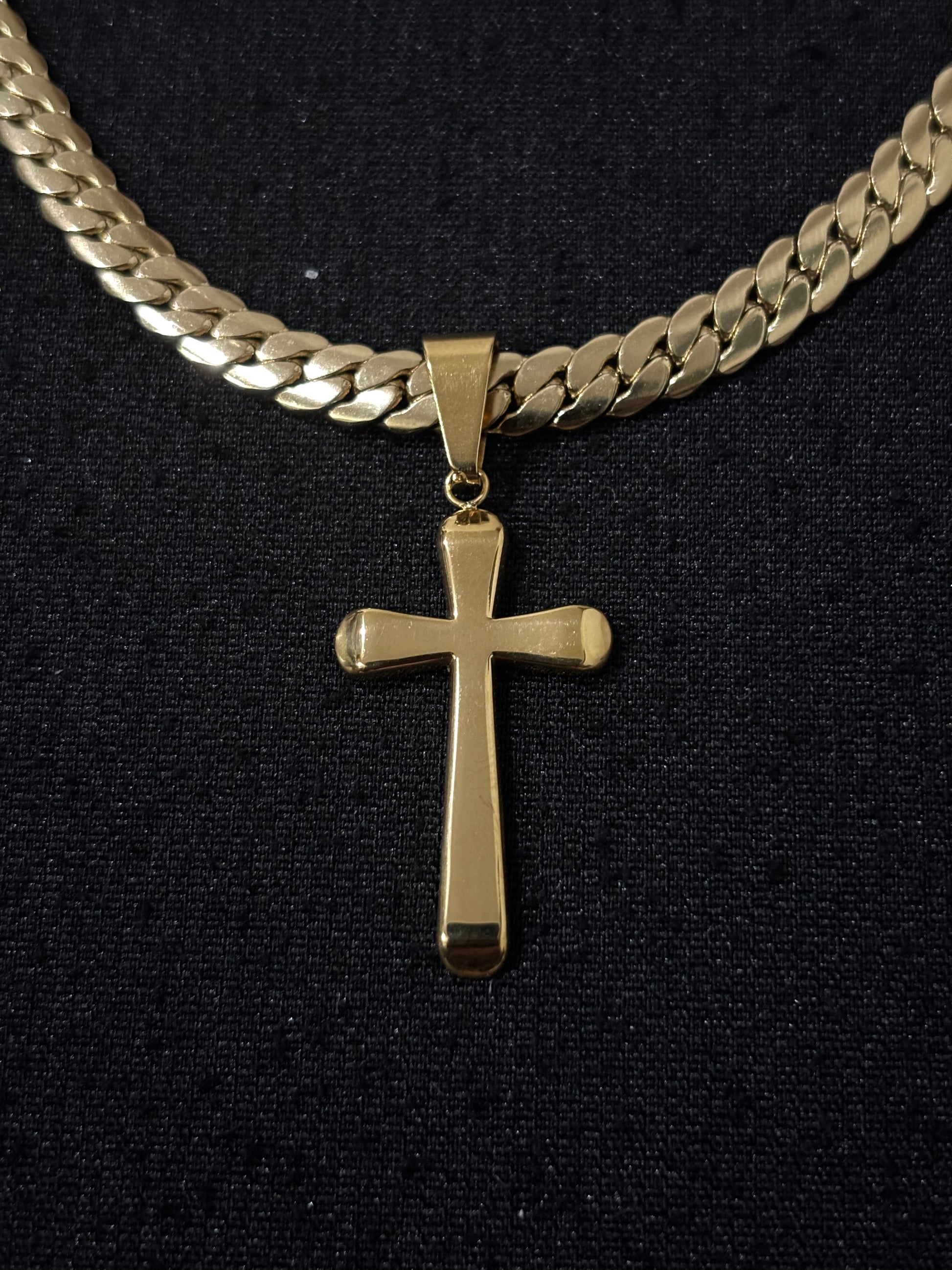 Combo en Oro Laminado 18K: cadena serpiente de 65 cm, con un tejido cerrado que imita las escamas de la serpiente, brindando un acabado brillante y flexible que se adapta con elegancia al cuello. Se acompaña de un dije de cruz, imponente y lleno de carácter, que añade fuerza y estilo a la pieza. Con broches contramarcados 18K, este conjunto combina simbolismo y distinción en un solo diseño.