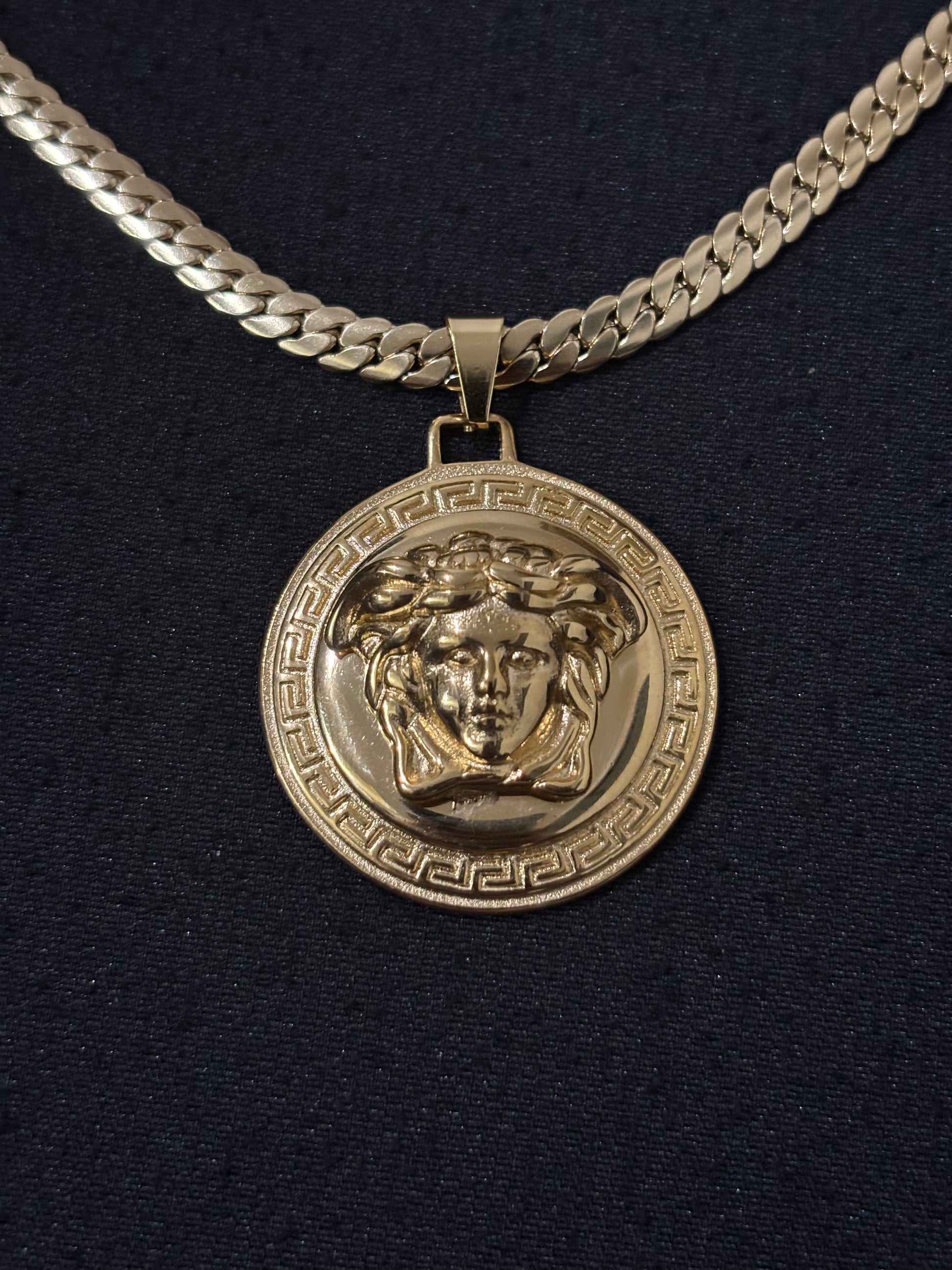 Combo en Oro Laminado 18K: cadena serpiente de 65 cm, con un tejido que imita las escamas de la serpiente, aportando un brillo continuo y elegante en cada movimiento. Se complementa con un dije Versace, símbolo de lujo y personalidad audaz. Con broches contramarcados 18K, es un conjunto que combina distinción y carácter en una sola pieza.