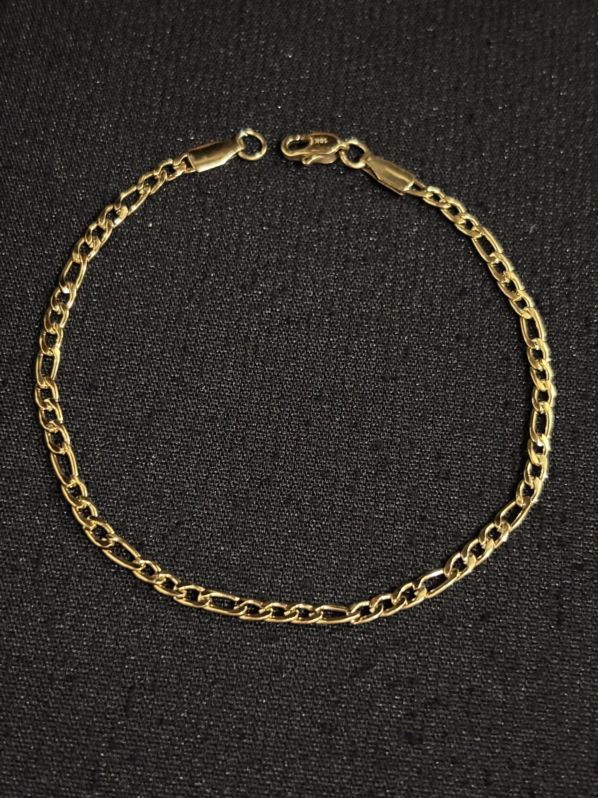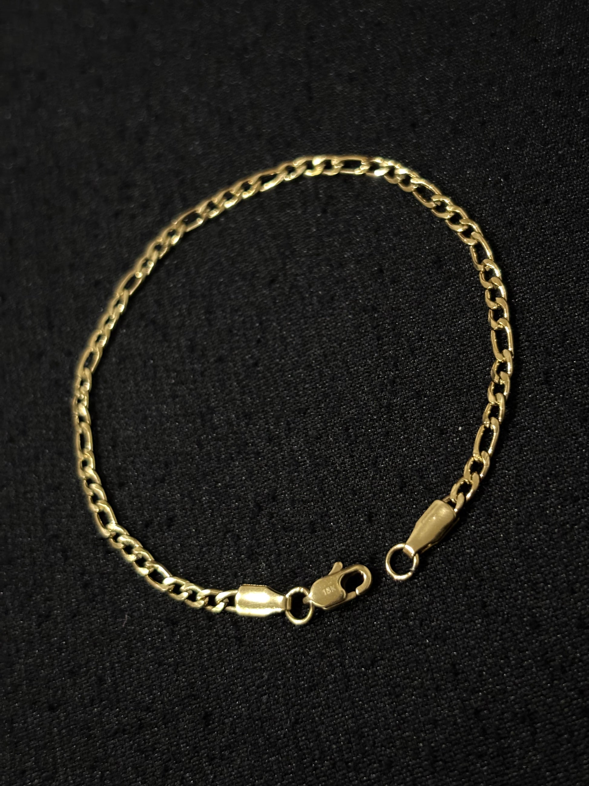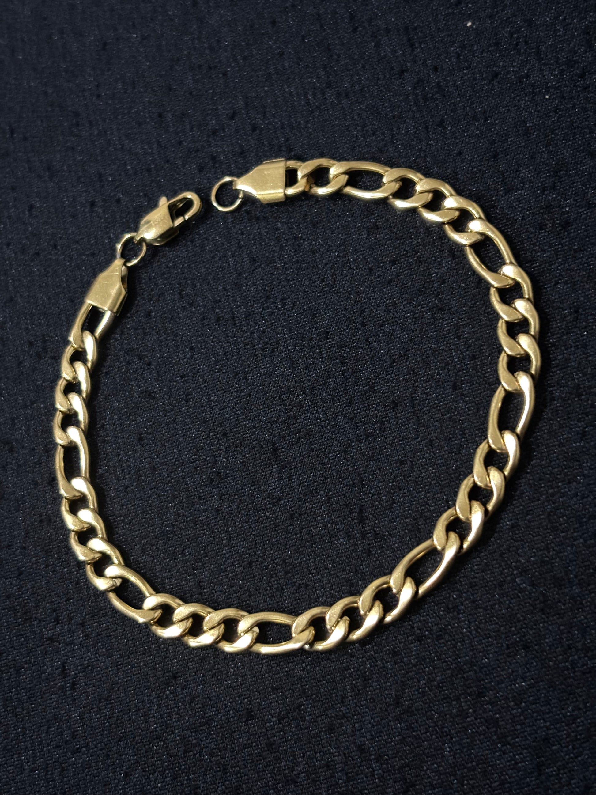 Pulsera 3x1 en oro laminado de 18K. Su diseño de eslabones alargados y profundos crea un contraste llamativo en la muñeca, con un estilo refinado pero contundente. El broche 18K contramarcado refuerza su calidad, convirtiéndola en un accesorio pensado para destacar sin exceso.